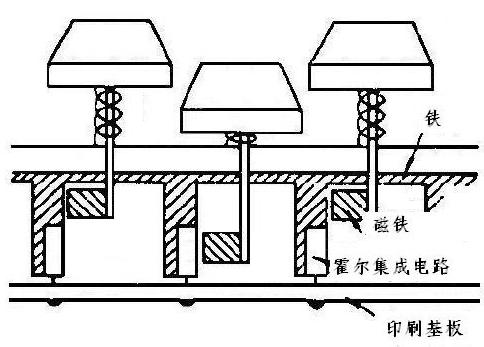 霍爾集成電路通常使用于前述磁電變換組件的項(xiàng)所述的(A-1)、(A-2)范圍的用途,在這些用途的中,特別像開關(guān)那樣,以磁氣為媒介將位置的變化、速度、回轉(zhuǎn)等的物理量變換為電氣量時(shí),使用起來非常簡(jiǎn)單。使用霍爾集成電路的開關(guān)系如圖2-21所示,這種開關(guān)具有:(1)無震動(dòng)(Chattering),(2)不生雜音,(3)使用壽命長(zhǎng),可靠度高,(4)響應(yīng)速度快等特征,已經(jīng)實(shí)際被使用作為高級(jí)的鍵盤用開關(guān)。