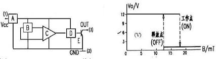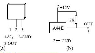 圖11是A44E集成霍耳開關(guān),A44E集成霍耳開關(guān)由穩(wěn)壓器A、霍耳電勢(shì)發(fā)生器(即硅霍耳片)(mT)、差分放大器C、施密特觸發(fā)器D和OC門輸出E五個(gè)基本部分組成,如圖12(a)所示。(1)、(2)、(3)代表集成霍耳開關(guān)的三個(gè)引出端點(diǎn)。在輸入端輸入電壓VCC,經(jīng)穩(wěn)壓器穩(wěn)壓后加在霍耳電勢(shì)發(fā)生器的兩端,根據(jù)霍耳效應(yīng)原理,當(dāng)霍耳片處在磁場(chǎng)中時(shí),在垂直于磁場(chǎng)的方向通以電流,則與這二者相垂直的方向上將會(huì)產(chǎn)生霍耳電勢(shì)差HV輸出,該HV信號(hào)經(jīng)放大器放大后送至施密特觸發(fā)器整形,使其成為方波輸送到OC門輸出。