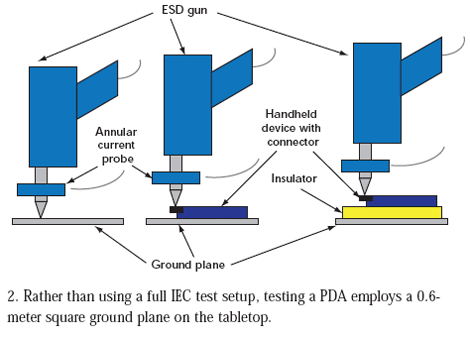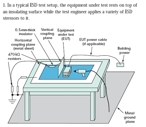 這樣的測試環(huán)境必然能實現(xiàn)可重復的結果。首先,將被測設備(EUT)放在絕緣表面上,然后從不同的方向對EUT施加沖擊。例如,給導電表面施加接觸放電,這些表面包括所有金屬外殼和連接器的接地金屬殼。也可以向四周絕緣表面進行空氣放電,并將重點放在可能的ESD路徑上,比如設備外殼中的縫隙以及所有通風孔及鍵盤。