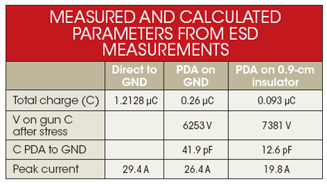 對充電到PDA的電流進行積分,可以得到從ESDqiang轉移到PDA的電荷數(shù)量。從ESDqiang轉移到PDA的電荷量可以用來計算ESDqiang的150pF電容上剩下的電壓,然后再算出PDA上的電壓。理解這個電壓以及PDA上測到的電荷之后,就可以計算出PDA和接地板之間的電容(見表1)。