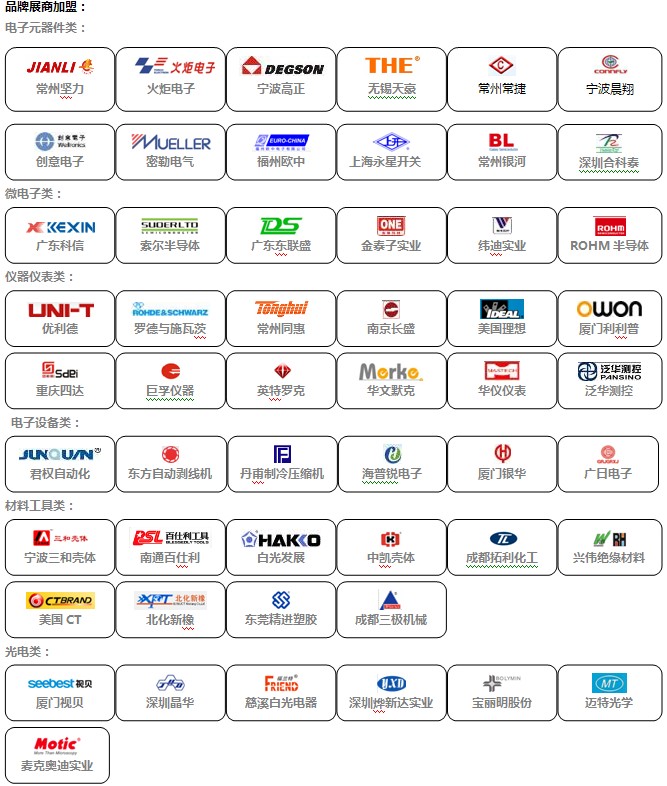 展示范圍:電子元器件、電子材料;制造設(shè)備、測(cè)試/測(cè)量設(shè)備;汽車電子、航空航天/軍用電子、交通電子、工業(yè)自動(dòng)化控制;消費(fèi)電子、電腦/網(wǎng)絡(luò)系統(tǒng)及外圍設(shè)備、通信產(chǎn)品/廣電設(shè)備;電力電子、安防電子