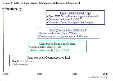 從信息娛樂角度來看,iSuppli公司認(rèn)為將轉(zhuǎn)向分層式軟件架構(gòu),設(shè)備在整體產(chǎn)品壽命期內(nèi)不被鎖定。通過Genivi、Android或Windows Embedded Automotive實(shí)現(xiàn)的本地應(yīng)用支持,提供支持這種功能的靈活性。iSuppli公司還認(rèn)為,Terminal模式將在市場(chǎng)上火起來,盡管面臨挑戰(zhàn)。在中間,有一類通過定制軟件接口運(yùn)行的非本地應(yīng)用,如福特的Sync,或者家中眾多其它的連網(wǎng)設(shè)備。