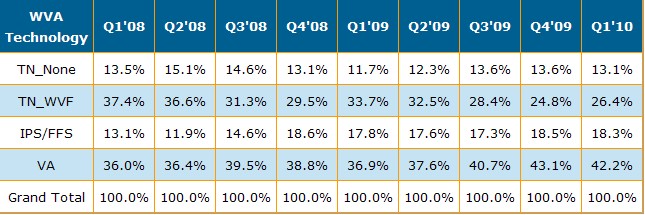 下表則表示了2010年第一季在不同的應用方面各種不同的視角技術的比重?;旧显贜otebook 以及LCD Monitor的面板只有相當少的比重采取了高階的IPS或VA的技術,而在LCD TV的部份,VA型的出貨面積高達60%。