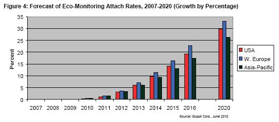 上述每類(lèi)應(yīng)用的汽車(chē)配售率預(yù)計(jì)都會(huì)增長(zhǎng),2010-2013年增長(zhǎng)比較緩慢,隨后從2014年開(kāi)始基本以?xún)晌粩?shù)的速度增長(zhǎng),直到2020年末。iSuppli公司的圖表顯示,節(jié)能監(jiān)測(cè)和節(jié)能建議近期將大幅增長(zhǎng),而由于復(fù)雜性和需要與其它汽車(chē)系統(tǒng)整合,節(jié)能動(dòng)力總成的布署比較緩慢。但到2020年,美國(guó)和西歐的節(jié)能動(dòng)力總成應(yīng)用將達(dá)到35%的配售率,接近節(jié)能監(jiān)測(cè)和節(jié)能建議系統(tǒng)的水平。