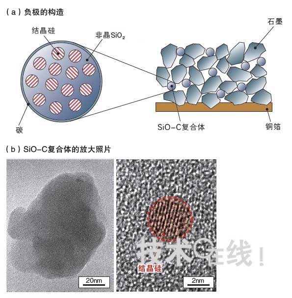負(fù)極采用日立麥克賽爾量產(chǎn)的硅類材料的單元混合了SiO-C復(fù)合體和石墨(a)。SiO-C將nm級(jí)的硅分散到非晶SiO2的構(gòu)造體內(nèi)(b)。圖由本站根據(jù)日立麥克賽爾的資料制作。