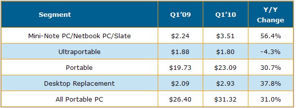 根據(jù)DisplaySearch最新調(diào)查結(jié)果表示,2010年第一季度筆記本電腦出貨金額達(dá)311億美金,這是自2008年第三季以來最高單季出貨紀(jì)錄,當(dāng)時筆記本電腦均價較目前高出20%。除了取代臺式電腦的筆記本電腦(Desktop Replacement)均價下降外,其它應(yīng)用領(lǐng)域如上網(wǎng)本/平板電腦(netbook PC/ slate),與超可攜式電腦(ultraportable)均價均有兩位數(shù)的增長。