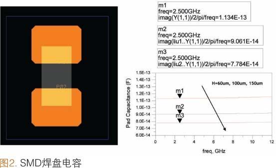 雖然01005SMD電容已面市一段時(shí)間,但是因?yàn)樵r(jià)格和組裝成本較高,并沒(méi)有成為RFSiP的普遍選擇。我們對(duì)帶有焊盤(pán)分布和互連線的0201SMD電容進(jìn)行了研究。