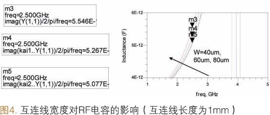 [page]除互連線長(zhǎng)度之外,互連線的寬度也會(huì)對(duì)RF電容產(chǎn)生影響。在襯底的制作過(guò)程中,線寬通常會(huì)發(fā)生變化(舉例來(lái)說(shuō),與設(shè)計(jì)寬度相比,實(shí)際線寬的變化范圍為±10.0μm~±15.0μm)。如圖4所示,如果設(shè)計(jì)的互連線為1.0mm長(zhǎng),60.0μm寬,實(shí)際卻達(dá)到40.0μm寬,在2.5GHz下等效電容變化將達(dá)到5.3%(以3.0pF接地SMD電容為例)。如果把這種SMD電容用于濾波器中,對(duì)于RF應(yīng)用來(lái)說(shuō),電容值5.3%的變化將導(dǎo)致約2.7%的頻移。我們必須對(duì)RF應(yīng)用中含有SMD電容的RFSiP模塊的襯底制造容差進(jìn)行細(xì)致研究。