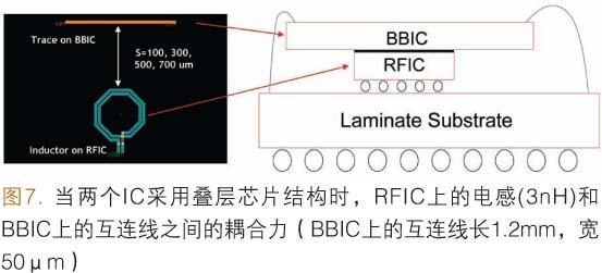 圖7給出了BBIC和RFIC采用SiP(為簡(jiǎn)單起見(jiàn),實(shí)例中未表示SMD元件)疊層芯片結(jié)構(gòu)的實(shí)例。在這個(gè)實(shí)例中未使用金屬屏蔽層,使用環(huán)氧芯片粘接材料把BBIC直接堆疊在RFIC上。就像前文提到的那樣,BBIC中的主時(shí)鐘信號(hào)(20.0MHz或40.0MHz)包含一些高頻成分,落在RF芯片通帶的范圍內(nèi)。如果BBIC中時(shí)鐘互連線和RF芯片之間沒(méi)有保持足夠的隔離,特別是在VCO電感中,主時(shí)鐘信號(hào)可能使RF電路產(chǎn)生噪聲,降低RF芯片的選擇性。