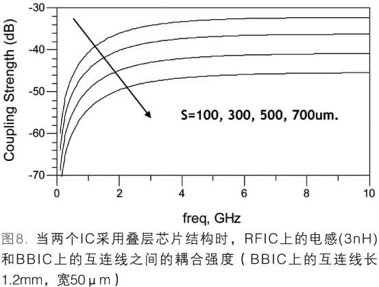 圖8表示了BBIC和RFIC電感之間的耦合強(qiáng)度(未使用隔離層)。假設(shè)BBIC和RFIC的厚度為250.0μm時(shí),對(duì)VCO電路中的3nH電感進(jìn)行了研究。BBIC中主時(shí)鐘的互連線設(shè)置為1.2mm長(zhǎng)。根據(jù)模擬結(jié)果,當(dāng)橫向距離(S)為100.0μm時(shí),2.5GHz下的隔離為-35dB。這一隔離值對(duì)大多數(shù)RF應(yīng)用來(lái)說(shuō)是不夠的。當(dāng)橫向距離為700.0μm時(shí),隔離值提高為-50dB,這個(gè)值對(duì)大多數(shù)RF應(yīng)用來(lái)說(shuō)仍然不夠。為保證VCO電感的性能,位于BBIC電感上方的主時(shí)鐘不能使用長(zhǎng)互連線。根據(jù)以上分析,我們還應(yīng)對(duì)RFSiP使用的疊層芯片法做進(jìn)一步研究,從而判斷BBIC和RFIC器件之間出現(xiàn)嚴(yán)重相互干擾的可能性。