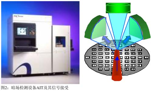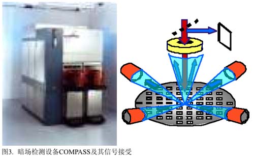 暗場(chǎng)檢測(cè)技術(shù)作為檢測(cè)晶片缺陷的有效手段之一,其優(yōu)點(diǎn)在于以下幾個(gè)方面:首先,在暗場(chǎng)獲得圖像的灰階易于控制和調(diào)節(jié)。暗場(chǎng)是位于硅片上方和硅片成30度角的區(qū)域,在此區(qū)域內(nèi)獲得的圖像灰階,可以通過(guò)調(diào)節(jié)激光的能量和探測(cè)器的敏感度來(lái)輕松控制;其次,在暗場(chǎng)內(nèi),可以很容易地辨認(rèn)有具體形態(tài)和位于硅片表面的缺陷,比如刮傷、微粒之類的缺陷;最后,使用暗場(chǎng)的檢測(cè)速度非??欤杀鞠鄬?duì)比較低,通常被用作快速分析影響產(chǎn)量的各類缺陷超出界定值的問(wèn)題,AIT和COMPASS是在半導(dǎo)體制造企業(yè)廣泛應(yīng)用的暗場(chǎng)檢測(cè)設(shè)備(如圖2和3所示)。[page]