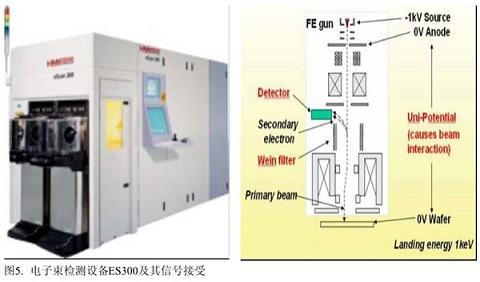 首先,它擺脫了照明光源,檢測(cè)結(jié)果不會(huì)受到類似變色、厚度不均等各種層面所帶來(lái)的物理因素的影響;其次,電子束的分辨率極高。因?yàn)樗臋z測(cè)單位是電子,電子要比微波以及任何尺寸的顆?;蛉毕荻家〉枚?;再次,電子是帶有電性的電荷,所以它可以被用于分析材料的電性或電組織成分,這被稱作電壓對(duì)比度圖像,經(jīng)常被用于檢測(cè)類似開閉鎖等電子電路缺陷和通孔蝕刻不足等材料缺陷。電子束檢測(cè)設(shè)備一般有KLA-Tencor和HMI公司的Escan系列(如圖5所示)。