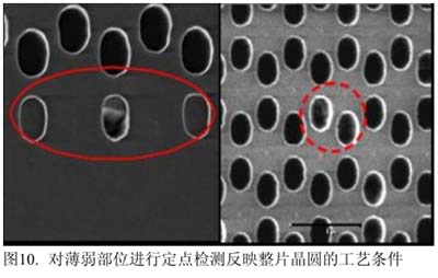 自動(dòng)工藝檢測(cè)技術(shù)是對(duì)電子束檢測(cè)技術(shù)補(bǔ)充。在實(shí)際生產(chǎn)過(guò)程中,常常能發(fā)現(xiàn)通孔刻蝕的一些系統(tǒng)性缺陷,它主要由于刻蝕設(shè)備及其工藝在調(diào)試過(guò)程中還沒(méi)達(dá)到最好的工藝窗口,或者工藝窗口的漂移使刻蝕設(shè)備的一些薄弱部位提前顯現(xiàn)在通孔刻蝕工藝過(guò)程中。實(shí)驗(yàn)過(guò)程中通過(guò)對(duì)一顆產(chǎn)品的薄弱部位進(jìn)行定點(diǎn)檢測(cè),來(lái)反映整片晶圓的工藝條件(如圖10所示)。