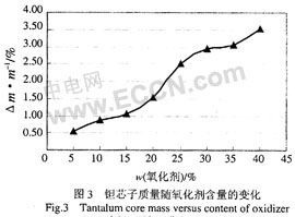 對于二步法生產(chǎn)工藝,單體為聚合反應(yīng)過程中的過量一方,聚合物生成的量由氧化劑的量來決定,聚合物在鉭芯表面的沉積數(shù)量隨氧化劑含量的增加而增加。從圖3可以看出,在相同的浸漬次數(shù)下,使用含量為5%的氧化劑陽極塊的質(zhì)量增加為0.54%,而使用含量為40%的氧化劑陽極塊質(zhì)量增加為3.52%,因此高含量的氧化劑可以有效增加聚合物的沉積量。