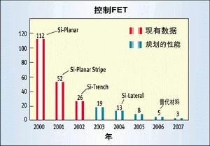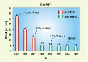 圖2所示的是同步或稱低端(low-side)FET的品質(zhì)因數(shù)。在這里,實(shí)際上是傳導(dǎo)損耗主宰了處在導(dǎo)通電阻時(shí)域的品質(zhì)因數(shù)。僅在過(guò)去的兩年中,通過(guò)將1至2微米溝道技術(shù)升級(jí)為深亞微米水平,就使品質(zhì)因數(shù)提高了約3倍,今后還有更多的改進(jìn)余地。