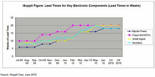 iSuppli指出,整體市場的交貨期比一個月以前所預(yù)期的拉長很多;例如功率 MOSFET 與小型訊號晶體管的交貨期在6月時約20周,雙極功率組件(bipolar Power devices)與整流器的交貨期則為18周;而在正常情況下,這些零組件的交貨期應(yīng)該是10~12周。