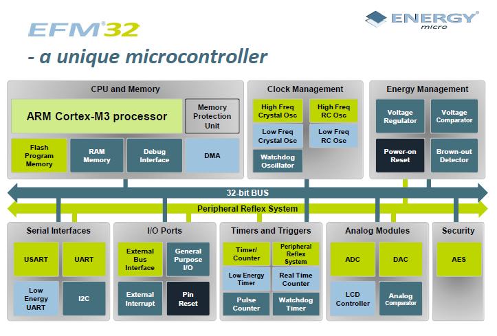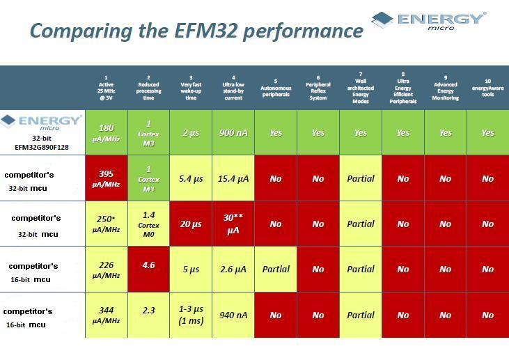 圍繞節(jié)能的ARM ® Cortex™- M3處理器架構(gòu),Giant Gecko, Gecko 和Tiny Gecko微控制器的使用證明它們可比競爭對手的8 - ,16 - 或32位微控制器節(jié)能四分之一。 這些微控制器具有僅為2μs的喚醒時(shí)間和MHz執(zhí)行代碼下每閃存180μA的電流消耗,深度睡眠模式下為900nA,關(guān)閉模式下為20nA,這些微控制器被證明有能力延長300%的標(biāo)準(zhǔn)電池壽命。