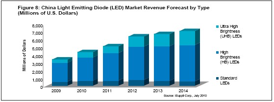 另外,憑借政府的支持和LED日益進(jìn)入液晶電視及普通照明等新的應(yīng)用領(lǐng)域,iSuppli公司預(yù)測(cè),2014年中國(guó)LED營(yíng)業(yè)收入將達(dá)到71億美元,而2009年是34億美元,其間的復(fù)合年度增長(zhǎng)率為12.8%。超高亮度(UHB)LED的增長(zhǎng)速度更快,到2014年銷(xiāo)售額將從2010年的6.86億美元上升到18億美元,復(fù)合年度增長(zhǎng)率為26.9%。
