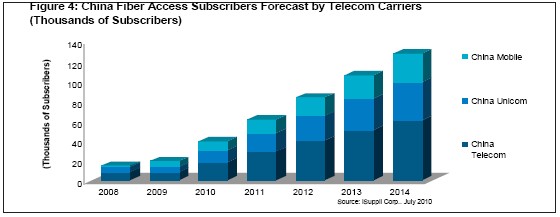 圖4所示國(guó)iSuppli公司對(duì)于2008-2014年各家運(yùn)營(yíng)商的光纖接入用戶數(shù)量預(yù)測(cè)。