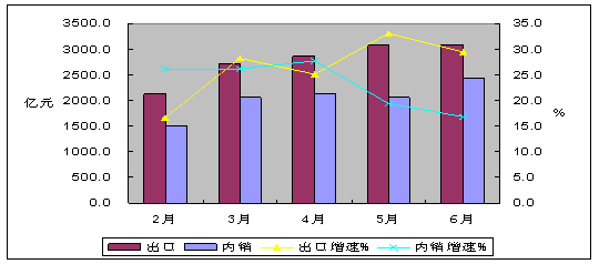 五、內(nèi)外銷保持同步增長,出口繼續(xù)快于內(nèi)銷。今年以來,隨著外需不斷回暖,外銷出現(xiàn)持續(xù)增長,到5月底,全行業(yè)累計外銷增速開始超過內(nèi)銷,進入6月份,外銷增速優(yōu)勢進一步加強,超過內(nèi)銷增速4個百分點。其中,內(nèi)銷產(chǎn)值11975.5億元,同比增長27.2%;出口交貨值16647.1億元,同比增長31.2%,高于產(chǎn)業(yè)平均增速1.7個百分點。產(chǎn)業(yè)出口依存度(58.1%)比去年同期提高0.7個百分點,比前5個月下降0.6個百分點。