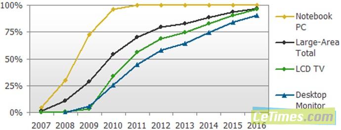LED背光源已經(jīng)成為TFT LCD產(chǎn)業(yè)一個(gè)重要的關(guān)鍵零組件,并且在未來幾年將持續(xù)成長。根據(jù)DisplaySearch最新一季「LED背光源研究分析報(bào)告」中指出,估計(jì)在2012年第四季大尺寸液晶面板采LED背光源面板出貨量將超過冷陰極燈管(CCFL)背光源面板出貨量,且滲透率將高達(dá)80%。