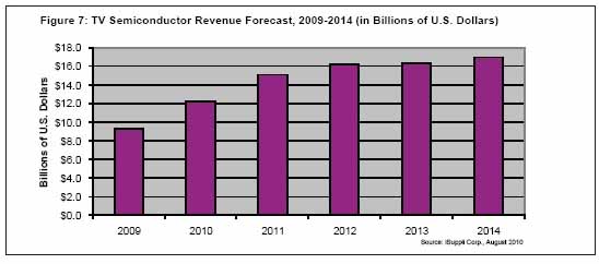 圖7所示為iSuppli公司對2009-2014年全球電視半導體市場銷售額的預測,覆蓋所有電視類型的芯片領域,包括液晶電視、等離子、背投和CRT。