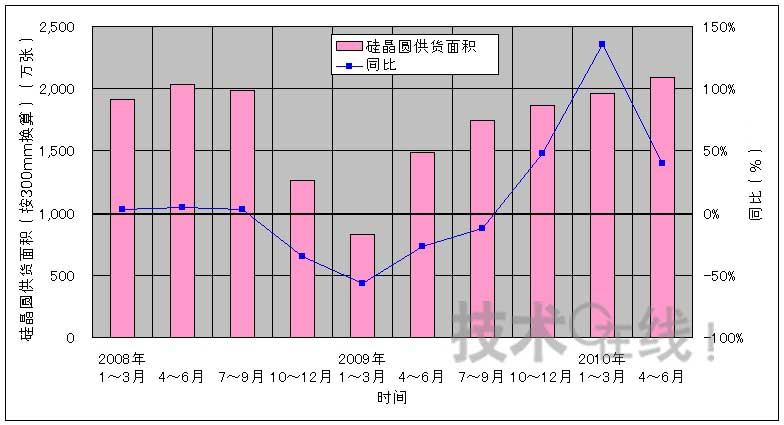 國際半導體制造設備材料協(xié)會(SEMI)公布了2010年第二季度(2010年4~6月)的全球半導體用硅(Si)晶圓供貨業(yè)績。發(fā)布資料顯示,硅晶圓供貨面積在2009年第一季度(2009年1~3月)觸底后連續(xù)五個月增加,突破了2000萬片(按300mm晶圓換算,下同)大關。超過了此前的歷史最高記錄——2008年第二季度(2008年4~6月)的1946萬片,刷新了歷史記錄。