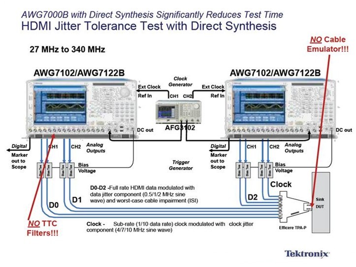 圖2:泰克獨(dú)一無二的AWG7000B直接合成方案可替換和省去所有類型的線纜仿真器和多達(dá)40個(gè)TTC濾波器,大幅降低HDMI接收端抖動(dòng)容限測試的復(fù)雜度,并有效降低成本。