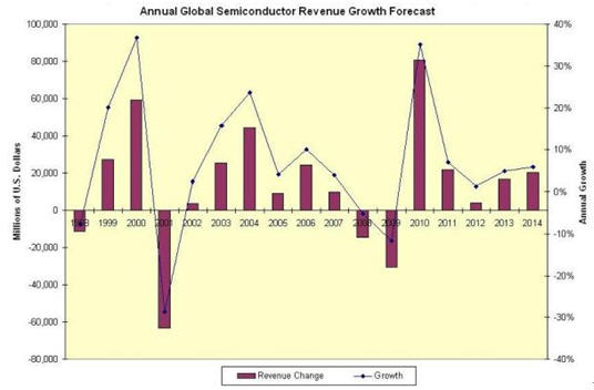 當2010年的增長與2000年相比時,要清楚此波周期的性質與2000年時有明顯的不同,這是十分重要的。2000年的增長是由于1999年的產能迅速擴充以及不能持久的網(wǎng)絡泡沫增長來推動,所以2001年泡沫破裂,導致半導體業(yè)下降28.6%。相比2010年的增長是由于受2009年的外力突然打擊,產業(yè)自身增長的動力暫時被壓抑,因而在2010年半導體產業(yè)能迅速回復,包括在2011年能繼續(xù)增長。