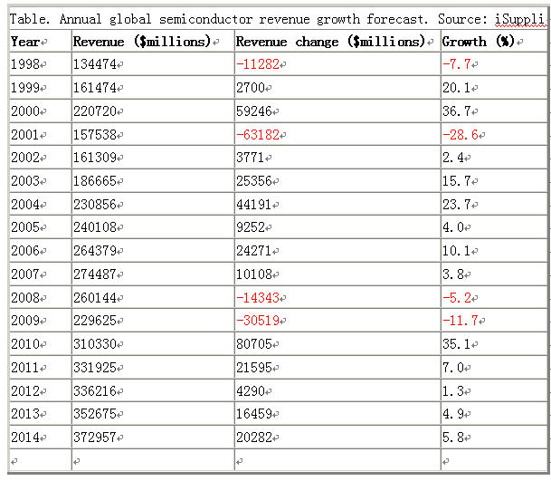 下圖是1998 to 2014年半導體銷售額及增長率預測;