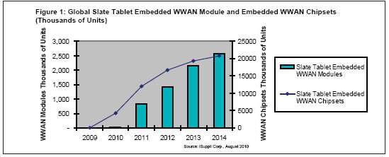 iSuppli公司預(yù)測(cè),到2014年,slate型平板電腦市場(chǎng)的嵌入WWAN芯片組出貨量將達(dá)到2070萬個(gè),而2009年幾乎是零。同時(shí),到2014年slate市場(chǎng)的嵌入WWAN模塊出貨量將達(dá)到210萬個(gè),而2009年出貨量也幾乎是零,其間的復(fù)合年度增長(zhǎng)率高達(dá)498.4%。所謂的slate型平板電腦,包括蘋果公司的iPad。