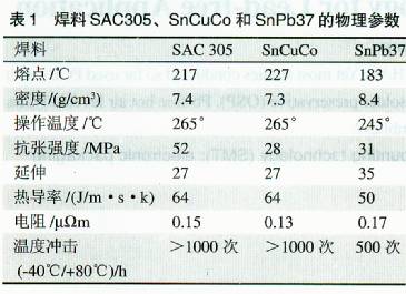 無鉛化合金熱風(fēng)整平工藝技術(shù)可分為兩大類:SnAgCu合金和SnCu合金。盡管說SnCu基合金與SnPb37的熔化點之間有固定的差異(44℃),但當(dāng)這兩大類合金在用于裝配和熱風(fēng)整平處理的時候,工藝操作溫度的實際差異在10℃~20℃之間。在采用熱風(fēng)整平工藝、波峰焊接和SMT。焊接設(shè)備進行操作時,SnPb合金通常在250℃~260℃的溫度范圍內(nèi)進行操作,而SnCuCo合金的工藝操作溫度在260℃一270℃的范圍內(nèi),SAC305合金在255℃.265℃的溫度范圍內(nèi)。表l詳細列舉了一些無鉛化焊料和SnPb合金的物理參數(shù)。