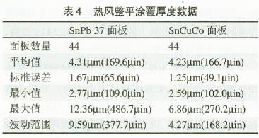 正如前文所談及的那樣,在實施PCB組件制造的時候,所采用熱風(fēng)整平工藝的比例從高達所有電路板中的80%減少到大約60%。隨著要求具有平坦一致的表面(共平面)的SMT技術(shù)穩(wěn)步發(fā)展,這種減少現(xiàn)象還會同步的發(fā)生。傳統(tǒng)的SnPb熱風(fēng)整平工藝能夠提供具有令人滿意共面性的SMT電路板?,F(xiàn)在關(guān)注的是無鉛化中熱風(fēng)整平會產(chǎn)生什么問題,經(jīng)無鉛化熱風(fēng)整平的電路板會更好還是更壞,或者與經(jīng)SnPb熱風(fēng)整平工藝處理的PCB組件是否具有相同的共平面效果?美國MetallicRe—sourcesInc公司的技術(shù)人員為此開始了一次又一次的試驗,結(jié)果表明SnCuCo比起傳統(tǒng)的SnPb共熔合金,會產(chǎn)生略簿一些、更趨共平面效果的涂覆。這些結(jié)果被反復(fù)地的進行研究。表4顯示了從一臺水平放置的熱風(fēng)整平設(shè)備上實施這些試驗的一些測試結(jié)果。