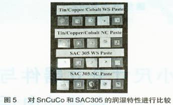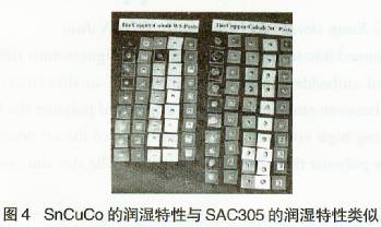 圖4顯示了SnCuCo合會的潤濕特性。它與存采用了各種涂覆方式的電路板上的SAC305具有非常相似的效果。這也就說明SnCuCo至少與SAC305一樣,在電路板潤濕方面具有相同的性能。