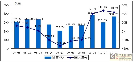 圖2008Q1——2010Q2中國集成電路產(chǎn)業(yè)銷售額規(guī)模及增長