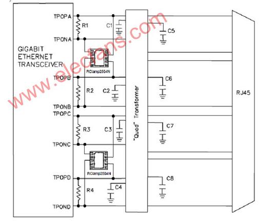 Semtech公司的RClamp2504N/3304N已被成功地應(yīng)用在電腦的RJ45連接器里,它具有較低的鉗位電壓,電容和工作電壓,這樣可以保護(hù)一些敏感的物理層的芯片。該解決方案將非常好,成本低,加上好的RJ45連接器結(jié)構(gòu)和PCB設(shè)計(jì)給線對地保護(hù)。