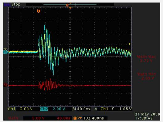 基本上,由于客戶有好的連接器結(jié)構(gòu)和PCB設(shè)計(jì),當(dāng)雷擊發(fā)生時(shí),它能通過結(jié)構(gòu)和PCB設(shè)計(jì)釋放,從這個(gè)+6KV雷擊測試結(jié)果看,我們發(fā)現(xiàn)波形看起來像振鈴,在PHY端鉗位電壓非常低,這說明大部分雷擊能量已被釋放,這時(shí)能很好的保護(hù)PHY芯片。