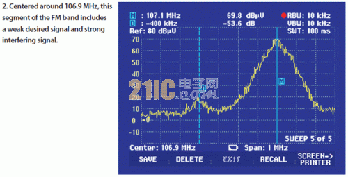 圖1顯示了這次在地圖上的測試行駛,其中3kW的發(fā)射機架在高大建筑物的樓頂。雖然天線在直接視線范圍內(nèi),但干擾源處于峰值水平,接收到的106.7MHz目標頻率信號質(zhì)量下降嚴重。圖2顯示了信號強度的典型頻譜,圖3顯示了測試行駛期間2個信號的強度。