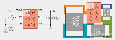 雖然工藝幾何尺寸的進步滿足了對超緊湊型、低價SD存儲器的需求,但這種大容量器件也帶來了功耗問題。利用專門針對這類應(yīng)用而設(shè)計的降壓轉(zhuǎn)換器FAN5362等產(chǎn)品來替代目前的LDO,可以解決這一難題。圖6是完整的FAN5362功率解決方案的典型原理示意圖和PCB版圖。