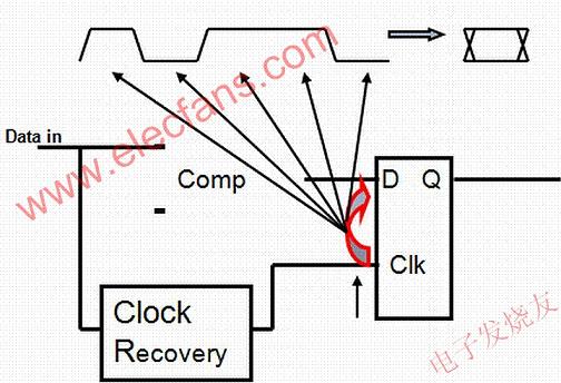 圖1:串行數(shù)據(jù)中的抖動,每個時鐘的數(shù)據(jù)級、上升沿和下降沿都在D處表示出來。數(shù)據(jù)鎖存是數(shù)據(jù)通信的關鍵環(huán)節(jié),在示波器上以眼圖形式顯示。