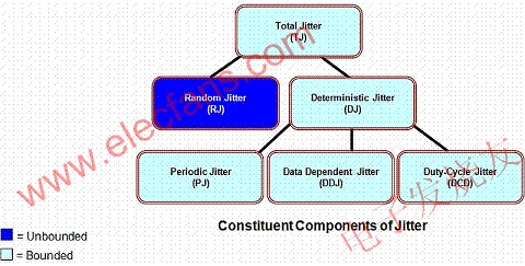在這種分級結構中,首先將總抖動分為兩類:隨機抖動和確定性抖動(Dj),然后再將確定性抖動分為若干類:周期抖動(Pj,有時也稱正弦波抖動或Sj)、占空比抖動(DCD)以及數(shù)據(jù)相關抖動(DDj,也稱符號間干擾ISI)。有時也會加入另外一個類別,即有界不相關抖動BUj。