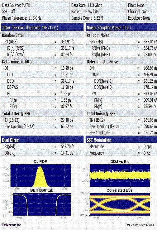 目前市面上性能最好的一款FPGA是數(shù)據(jù)率為11.3Gbps的AlteraStratixIV。圖5所示的測試報告,根據(jù)高性能采樣示波器采集的數(shù)據(jù)生成,當Tj為22.18ps時Rj僅395fs。