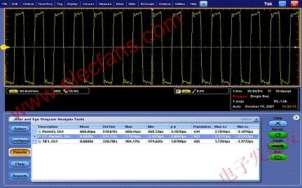 如果要測量在高信號速率時構成Tj的各分量,應采用本底噪聲低、頻率響應平穩(wěn)、抖動測量底限低和觸發(fā)抖動小的儀器。例如,ONSemiconductor發(fā)現(xiàn)在檢定其高速ECL器件時,需采用系統(tǒng)抖動<200fsRMS而且?guī)捿^寬的儀器。芯片設計者發(fā)現(xiàn)幾個ps的信號移位,甚至是在fs范圍內的移位,也可能干擾發(fā)送(TX)和接收(RX)性能。
