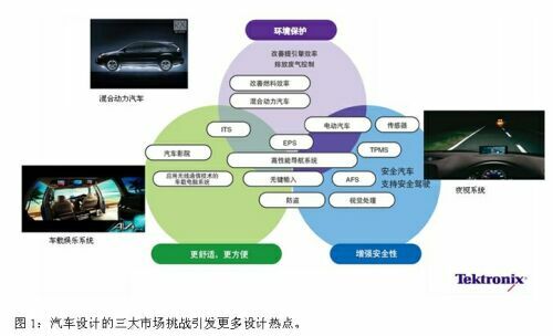 然而,面對日益復雜的汽車設計需求,特別是要推出中高端和商用的新能源汽車之時,自主創(chuàng)新和開發(fā)之路并非坦途。泰克科技的專家曾在不久前舉辦的一場汽車電子技術論壇上以擁有“100多個ECU、軟件代碼已經(jīng)達到700萬行”的豐田Lexus460汽車為例,強調(diào)了電子部件在汽車特別是高端汽車中所占據(jù)的比例越來越高。“如圖1,汽車電子關乎目前汽車設計的三大市場挑戰(zhàn),即如何滿足生態(tài)(環(huán)境保護)、更舒適方便和增強安全性的要求,而圍繞解決這些挑戰(zhàn)的系統(tǒng)和子系統(tǒng)正是目前汽車電子設計的熱點和難點。”他指出。“而局域網(wǎng)、動力系統(tǒng)、電子控制單元和數(shù)字RFID的應用在改善汽車生態(tài)學、安全性和舒適性方面扮演了重要的角色。