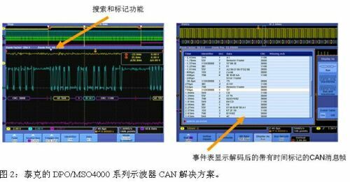 對于汽車中常用的CAN、LIN這類低速串行總線的調(diào)試,泰克的DPO/MSO4000系列示波器提供了簡單、易用、完整、高品質的觸發(fā)、捕獲和解碼解決方案。如圖2,該示波器系列提供了搜索和標記功能,可在事件表顯示解碼后的帶有時間標記的CAN消息幀,這一功能是其他競爭性產(chǎn)品所不具備的。