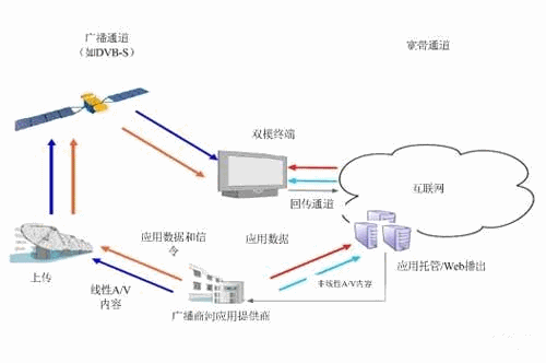 對(duì)運(yùn)營(yíng)商而言,數(shù)字電視數(shù)據(jù)業(yè)務(wù)可能來源于廣播信道(衛(wèi)星、有線或無線等)和/或?qū)拵诺溃ɑヂ?lián)網(wǎng)、或其它的IP通道)的信號(hào),音視頻與數(shù)據(jù)可以不加區(qū)分地由這兩個(gè)通道分別接入,在帶寬限制的情況下,廣播通道可以用來播送高清節(jié)目,而寬帶的使用形式就會(huì)有很廣,如視頻點(diǎn)播、時(shí)移、信息瀏覽、電子商務(wù)等。