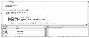 以配置開(kāi)始指令的發(fā)送為例,從圖3圖4兩圖中可以看出軟硬件交互過(guò)程中的指令發(fā)送方式,在VC++中單步調(diào)試,發(fā)送一個(gè)開(kāi)始指令0x01到配置命令寄存器地址0x01,通過(guò)硬件模塊的接口動(dòng)作,用嵌入式存儲(chǔ)器SignalTapII中捕捉到LA的數(shù)據(jù)為1h,LD上的數(shù)據(jù)為1h后ConfigStart寄存器置高,配置開(kāi)始。