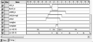 圖4中ADS_N、BLAST_N、LWORD_N、LHOLD、LHOLDA是LocalBus的接口信號(hào),ConfigEnd和ConfigStart是分別代表配置結(jié)束和配置開(kāi)始的標(biāo)志寄存器,LA是接口的地址信號(hào),用于模塊中控制寄存器的尋址,LD是接口的數(shù)據(jù)信號(hào),用于指令數(shù)據(jù)的發(fā)送和數(shù)據(jù)的回收。