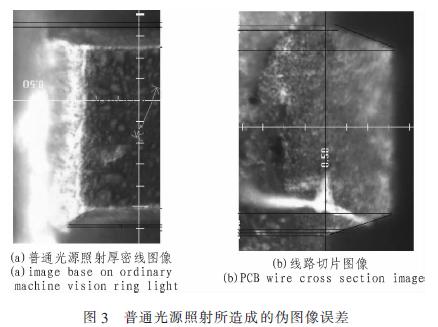 從圖中可以清晰地看到,目前的普通光源攝取的圖像和真實(shí)的截面圖有明顯的邊緣偏差,在2X的倍率下,1像素對應(yīng)的物面尺寸為1.61μm。偽圖像邊緣造成的線寬差別超過3像素。使得系統(tǒng)準(zhǔn)確度大為降低。該偽圖像邊緣產(chǎn)生的原因是由于普通光源光線照射角度過小。被厚密線路遮擋大部分光線后,基材和下線寬的亮度和顏色非常接近。而一般的線寬測試中,并沒有將該偏差計入測量結(jié)果。致使測量值產(chǎn)生一個固有方向的系統(tǒng)誤差,也就是說,如果該誤差不能被消除,所測得的數(shù)據(jù)不是真實(shí)PCB的線路特征的反映。而該誤差并不能通過改變圖像的清晰程度和對比度消除,只能依據(jù)PCB厚密線路的特點(diǎn)去改變光源的設(shè)計來消除或減小該誤差。