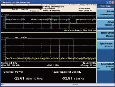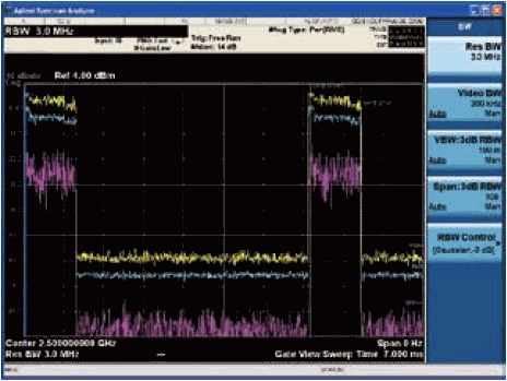 圖5圖中的信道功率測(cè)量僅顯示了前導(dǎo)碼的選通有了穩(wěn)定的觸發(fā),頻譜分析儀就可以啟動(dòng)掃描測(cè)量;